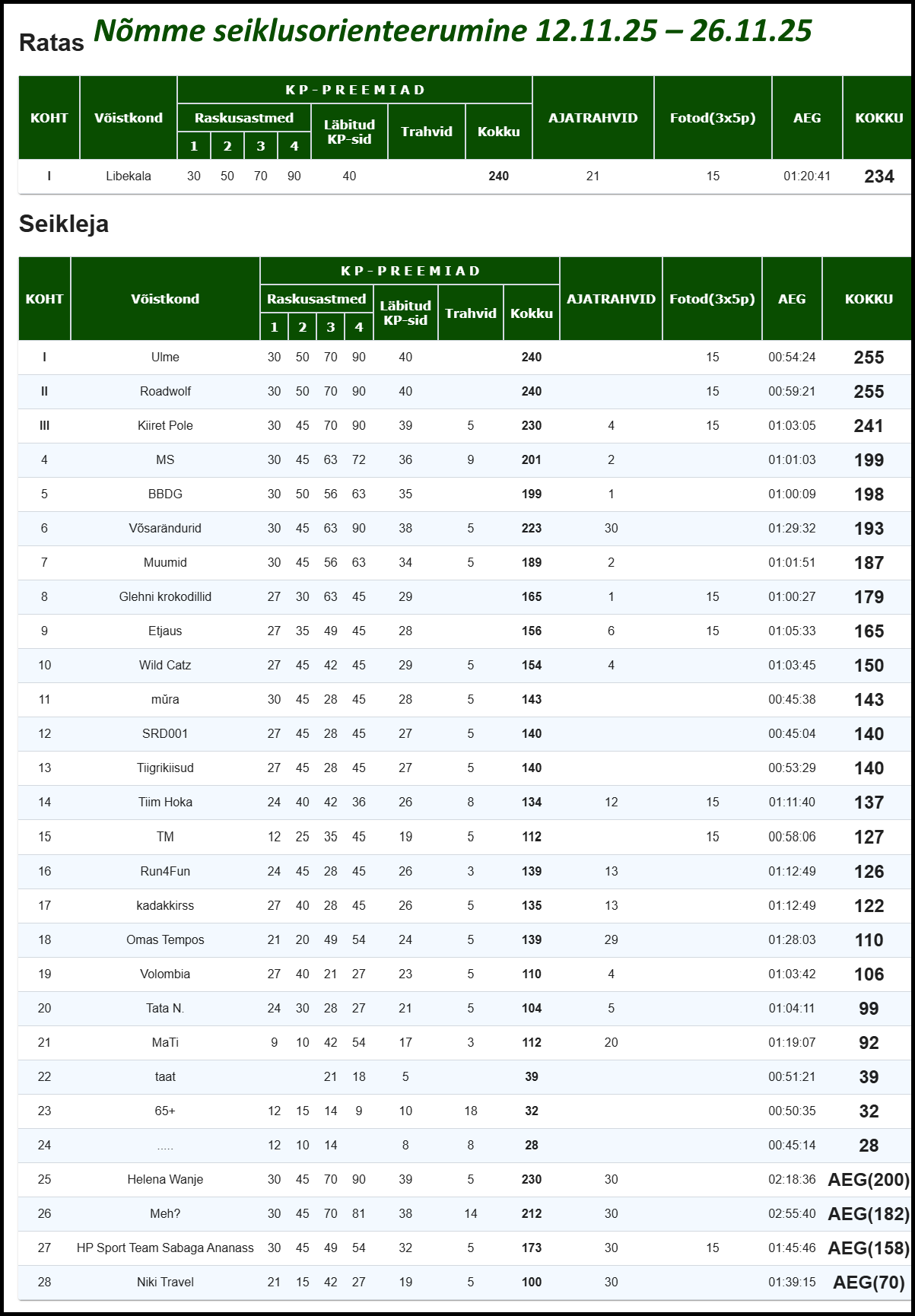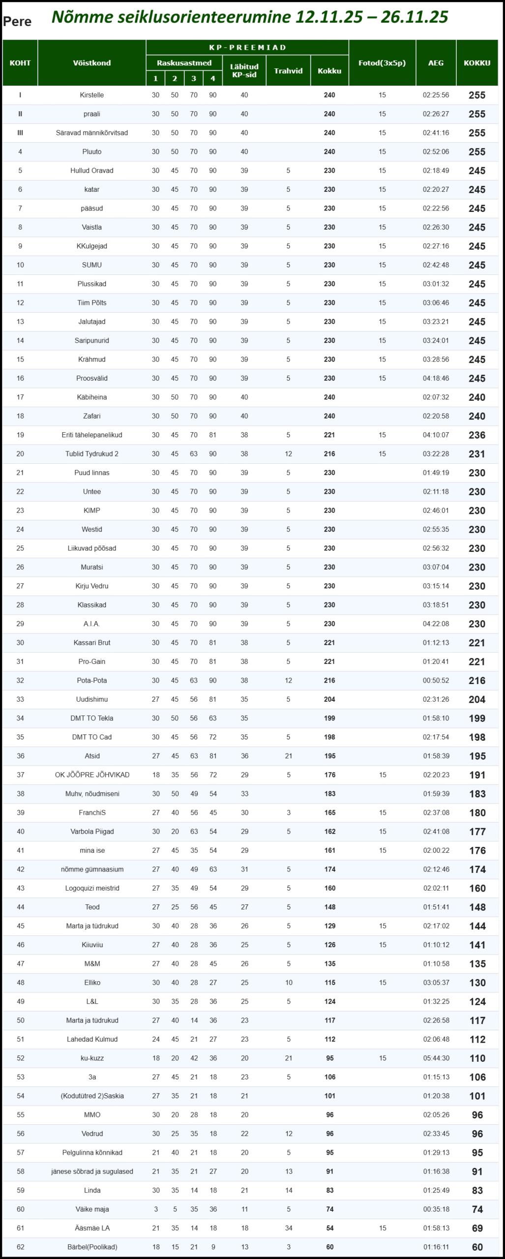 Nõmme seiklusorienteerumine 12.11.25 – 26.11.25 on saanud tänaseks läbi ja rajale jõudis kokku 91 tiimi. Aitäh kõigile osalejatele.