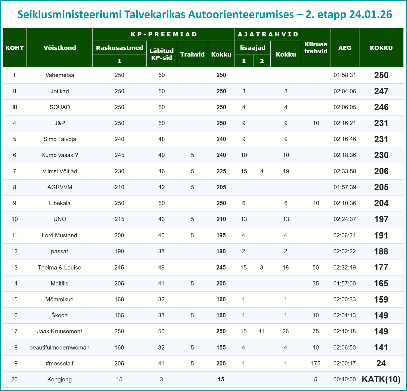 Seekord ületas kiirust 9 tiimi ja enamus rikkumisi toimusid 30 ja 60 alades. 11 tiimi suutis rikkumisi vältida. Aitäh, et sõitsite mõistlikult. Kui tegid rajal pilte, siis jaga neid sõidu FB lehel või oma seinal tägidega #autoorienteerumine #autoseiklus #seiklusministeerium #talvekarikas