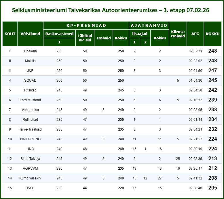 Rajal käis 15 tiimi ja nii pingelist heitlust pole ma korraldajana kaua näinud. Võidu noppis võistkond Libekala, teiseks sõitis end võistkond Maitliis ja kolmas oli võistkond J&P. Vahed olid ülimalt väiksed ja juba väike eksimus kiiruseületuse või vale vastuse eest kukutas tiime esikolmikust. Aitäh kõigile osalejatele ja loodan, et kohtume juba 07. märtsil Rapla kandis.